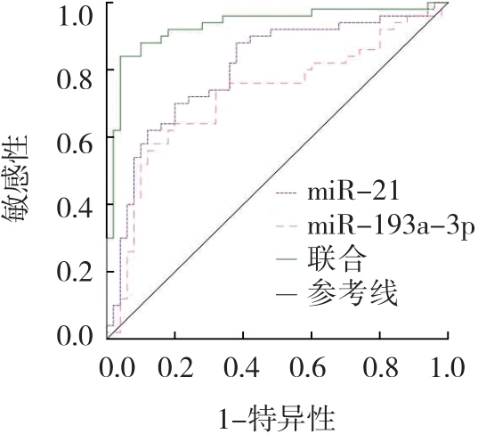 摘要:目的 探究血清microRNA-21(miR-21)、microRNA-193a-3p(miR-193a-3p)水平与结直肠癌患者手术预后的关系。方法 回顾性分析2020年1月—2022年1月苏州大学附属第一医院收治112例结直肠癌患者的病历资料。患者均接受结直肠癌根治术,术后随访16个月,记录患者的预后生存结局,多因素逐步Logistic回归分析结直肠癌患者手术预后的影响因素,评估血清miR-21、miR-193a-3p对结直肠癌患者预后的预测效能。结果 112例结直肠癌患者死亡22例,病死率为19.64%;生存90例,生存率为80.36%。死亡组术前血清miR-21 mRNA相对表达量、临床分期Ⅲ期占比、淋巴结转移率均高于生存组(P <0.05),血清miR-193a-3p mRNA相对表达量低于生存组(P <0.05)。多因素逐步Logistic回归分析结果显示,临床分期Ⅲ期[O^R=3.777(95% CI:1.399,10.194)]、淋巴结转移[O^R=5.099(95% CI:1.715,15.156)]、miR-21表达升高[O^R=4.889(95% CI:1.645,14.533)]、miR-193a-3p表达降低[O^R=4.402(95% CI:1.481,13.084)]均是直肠癌患者预后的影响因素(P <0.05)。受试者工作特性曲线分析结果显示,血清miR-21、miR-193a-3p单一及联合预测结直肠癌预后的敏感性分别为69.04%(95% CI:0.487,0.813)、72.73%(95% CI:0.495,0.884)、86.36%(95% CI:0.640,0.964),特异性分别为62.22%(95% CI:0.513,0.720)、68.89%(95% CI:0.581,0.780)、90.00%(95% CI:0.814,0.950),曲线下面积分别为0.782、0.731和0.901。结论 结直肠癌患者术前miR-21、miR-193a-3p表达与术后预后密切相关,且在结直肠癌患者的预后结局中表现出良好的预测效能。
